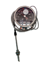 指针式油位计 指针式油位计用于衡阳10000KVA大型电力变压器的储油柜上。当储油柜内的油位发 生变化时,使得油位计连杆上的浮球上下摆动,经过油位计内部机构的传动,带 动指针轴的转动,将储油柜的油位在表盘上通过指针指示出来。同时,信号变送 电路将油位信号转换为4~20mA工业标准电流信号,传送到控制室。可实现远距 离油位监测和报警。 |